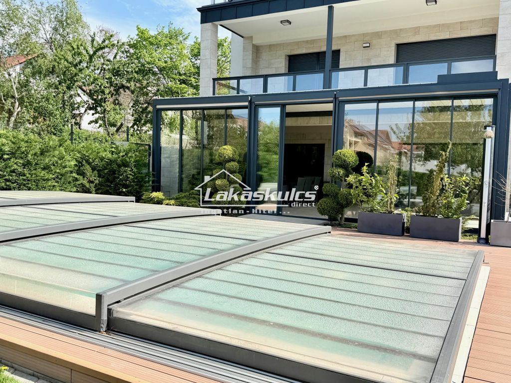 2 külön bejárattal, főbejáratból, s kertből is megközelíthető, 2db autóbeállóval, 110 m2 + 40 m2 terasz, ami télikert is így lakható m2 + kert, 6 szoba panorámás terasszal zárt, saját kert,8x4 m fűthető medencével ellenáramoltatóval.A legmodernebb, s a legmagasabb minőségű anyagokból épült, nagyon odafigyelve az energiahatékonyságra. Az ingatlan egy dupla lakás, 2 külön bejárattal.Nem csupán az ingatlan minősége, hanem lokációja miatt is igazi ritkaság a piacon, s teljesen intim.A kényelem és a nagy terek a jellemzőek, hihetetlenül átgondolt, s profi.Pár műszaki jellemző:padló fűtés, mennyezet hűtés, fűtése-hűtése DAIKIN hőszivattyúvalMindenhol gyönyörű Marazzi lapok, 25 cm grafitos Austrotherm szigetelés, tetőn Medicomfort 22-es pir szigetelés, s még pluszban 10cm Rockwool kőzetgyapot. A cserép Terrán Zenit betontetőcserép Generon integrált napelemmel. Nyílászárók 3 rétegű Kömmerling, hőszigetelt alumínium redőnyökkel, szúnyoghálóval, belső ajtók mind Jafholz.Riasztó, kamerák (éjjellátós) kiépítve.A bútorok tekintetében minden egyedi, ide gyártott gyönyörű asztalos munka.Helyiségek lakásonként:Hatalmas előtér, nappali-étkező-konyha, 2db hálószoba, fürdőszoba, külön toilette, háztartási helyiség( gardrobe), közlekedő, hatalmas terasz elhúzható hőszigetelt üveggel, árnyékolóval, medence.Hatalmas előtér, nappali-étkező-konyha, 2db hálószoba, fürdőszoba, külön toilette, háztartási helyiség, gardrobe, közlekedő, panoráma terasz medencekapcsolattal.