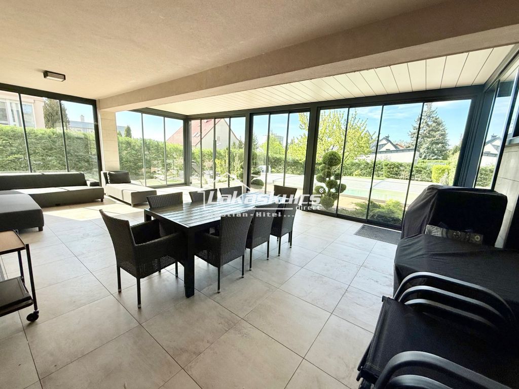 2 külön bejárattal, főbejáratból, s kertből is megközelíthető, 2db autóbeállóval, 110 m2 + 40 m2 terasz, ami télikert is így lakható m2 + kert, 6 szoba panorámás terasszal zárt, saját kert,8x4 m fűthető medencével ellenáramoltatóval.